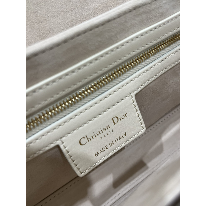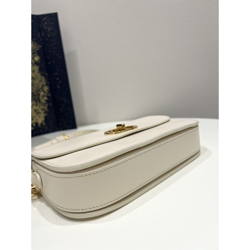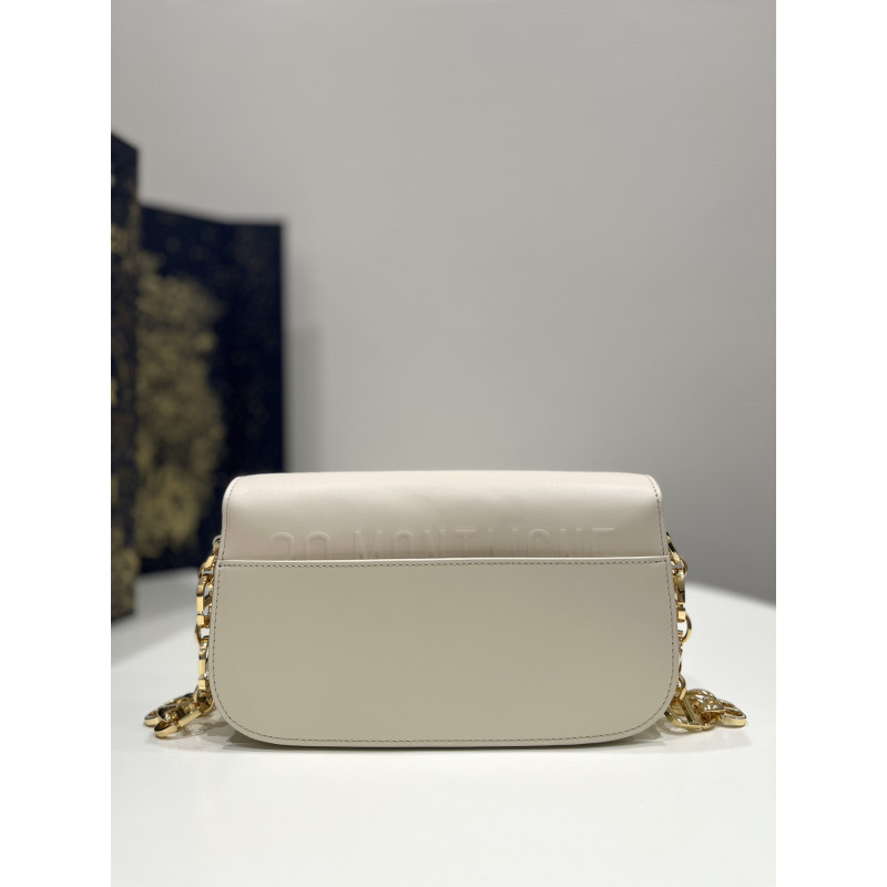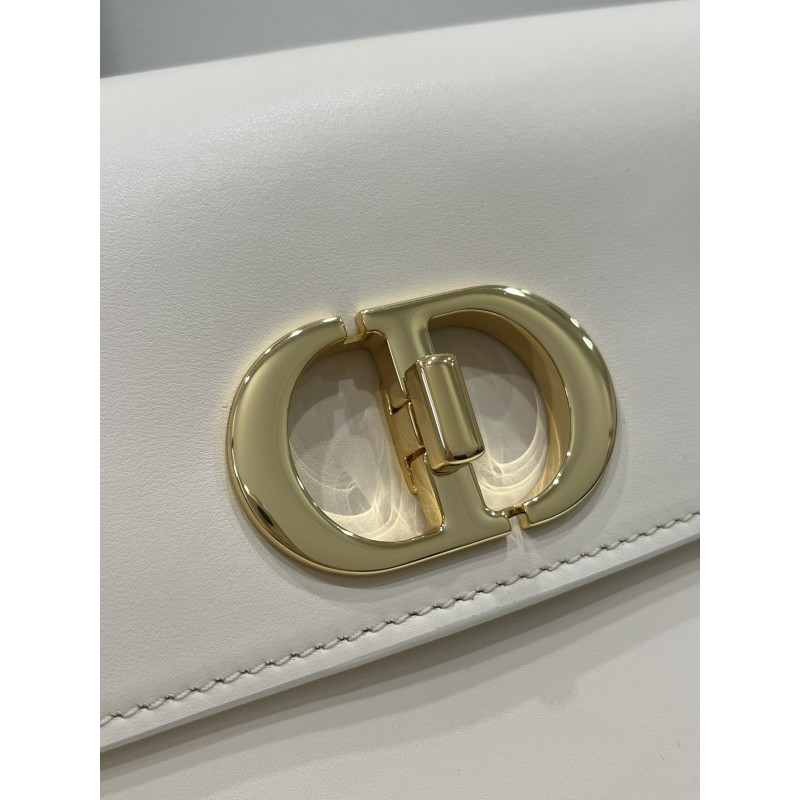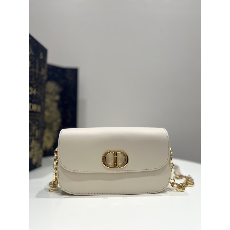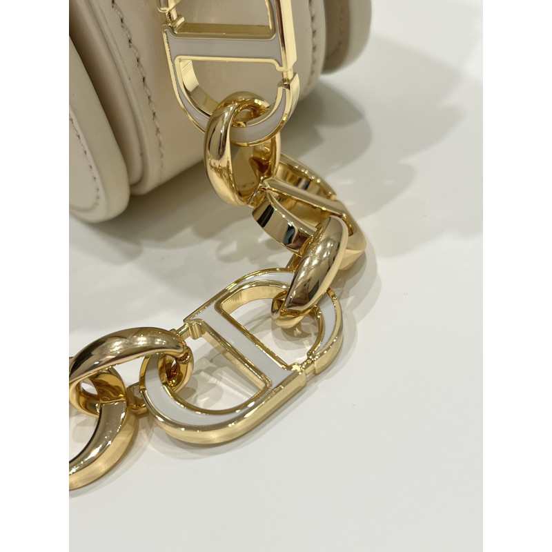Round flap crafted in calfskin with antiqued gold-plated metal CD clasp, 30 Montaigne logo embossed on the back, and a signature chain with alternating gold-finish metal and tone-on-tone enamel links to match the leather, adjustable. The bag is roomy and refined in shape and can be carried in the hand, over the shoulder or across the body.