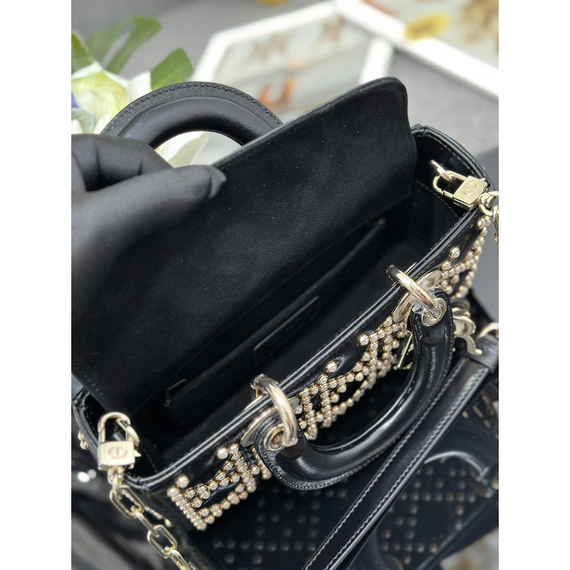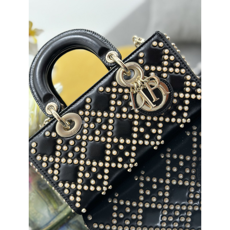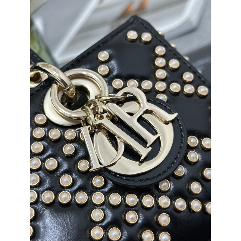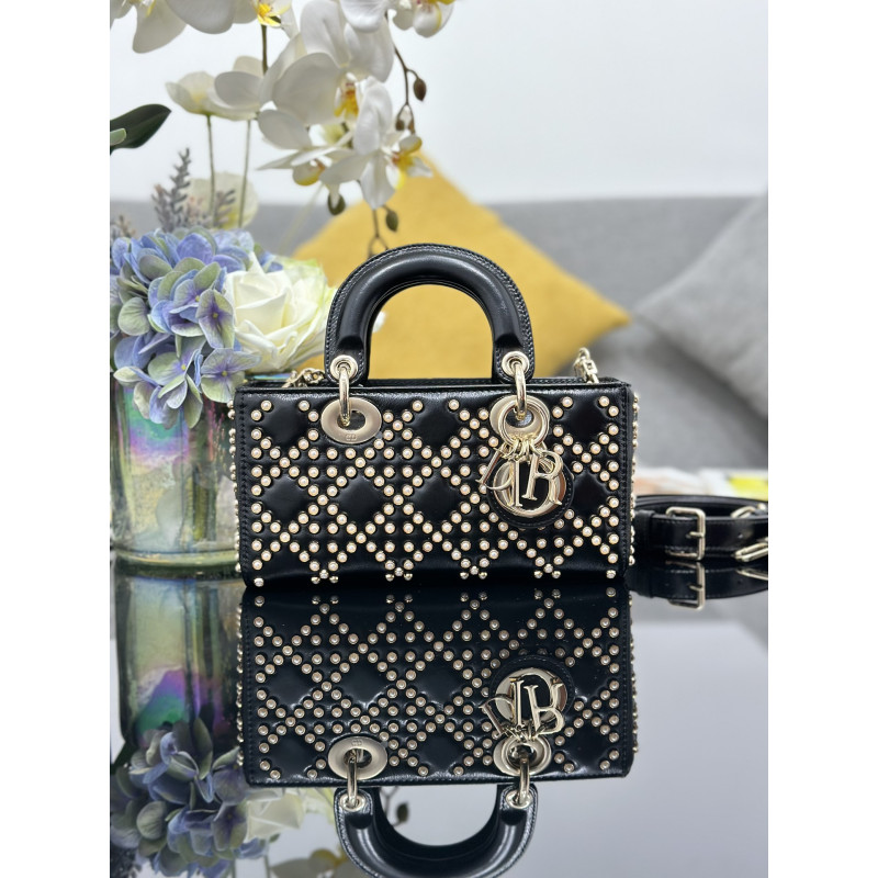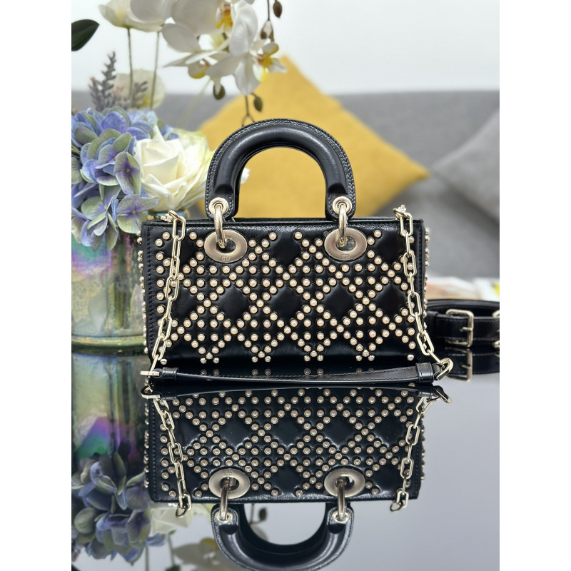 DetailFeaturing tonal mini beadwork in lattice patterns, showcasing Dior's exquisite craftsmanship. Accented with light gold-tone metal D.I.O.R. charms for an elegant silhouette. This compact design includes a detachable chain shoulder strap and adjustable leather strap, ideal for everyday versatility.