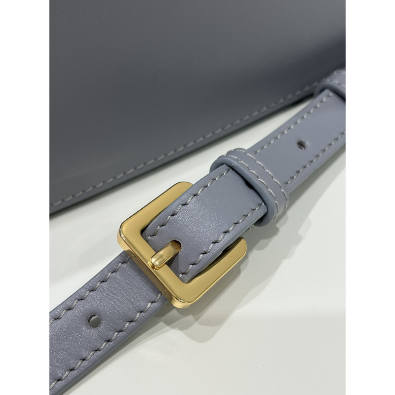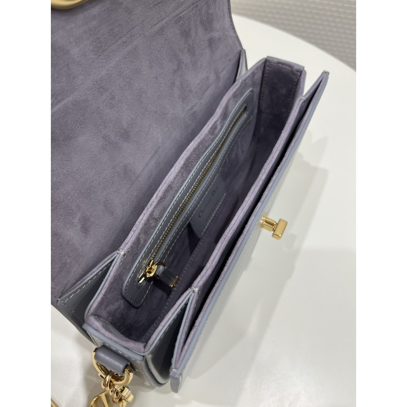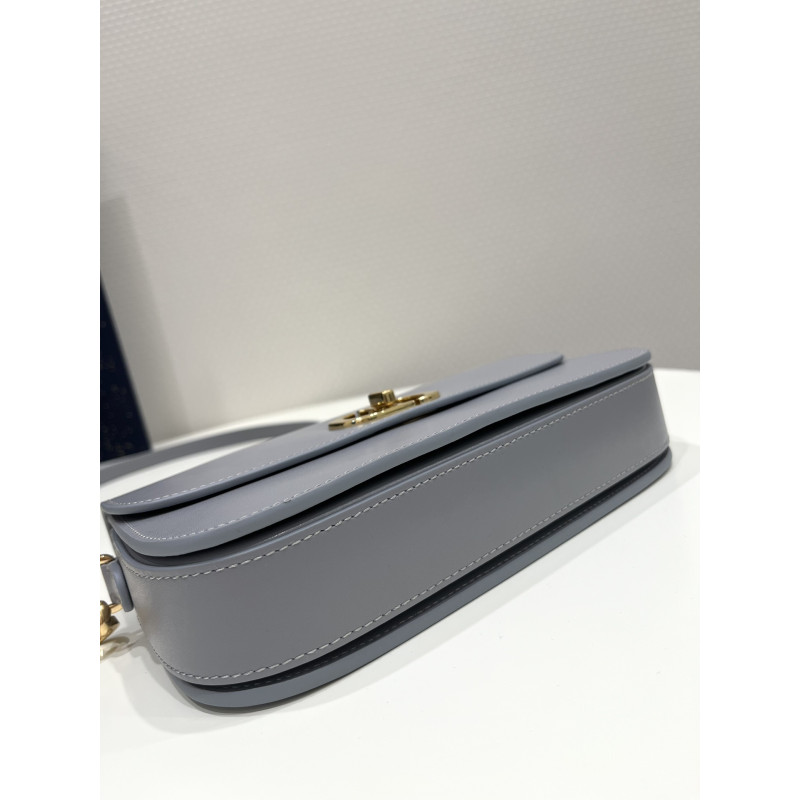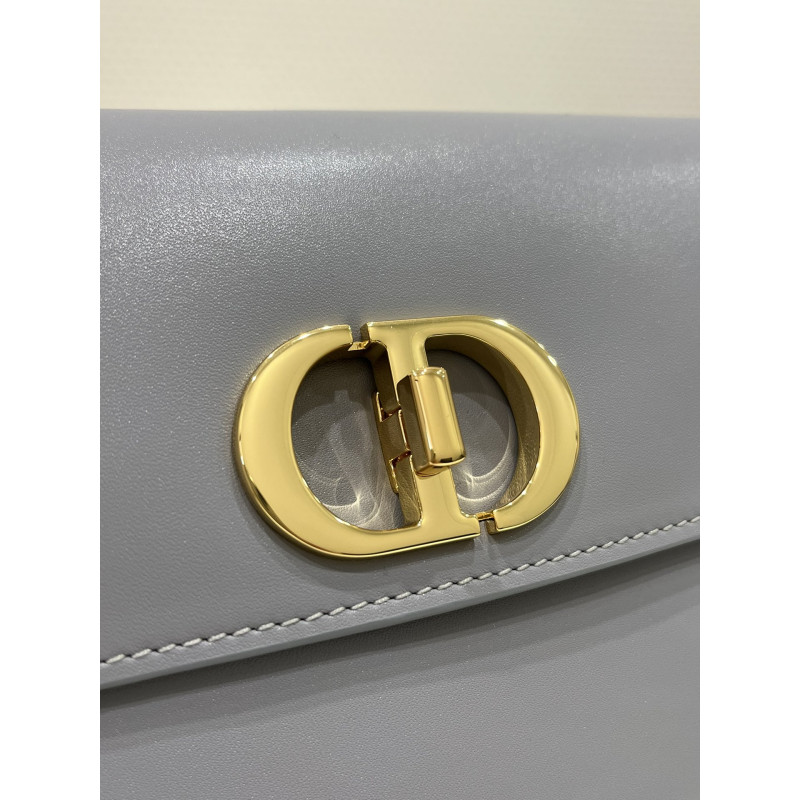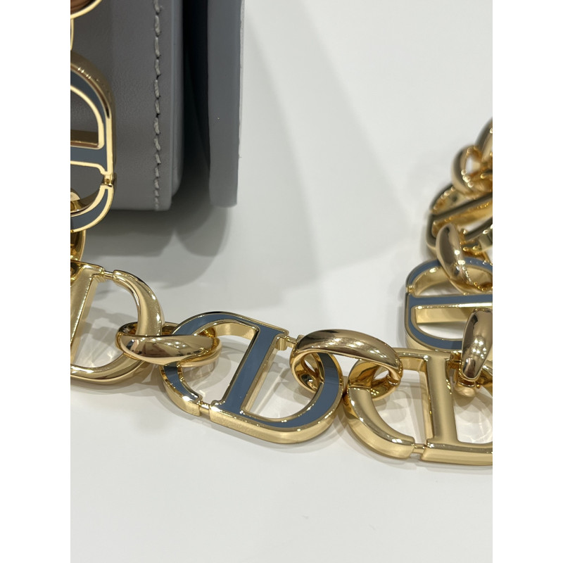 Round flap crafted in calfskin with antiqued gold-plated metal CD clasp, 30 Montaigne logo embossed on the back, and a signature chain with alternating gold-finish metal and tone-on-tone enamel links to match the leather, adjustable. The bag is roomy and refined in shape and can be carried in the hand, over the shoulder or across the body.