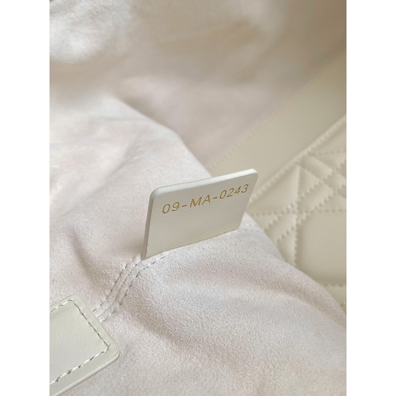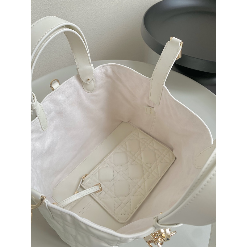 Oversized cannage pattern and the customary CD buckle, unlock the buckle to change from a square bag to a large tote bag,
