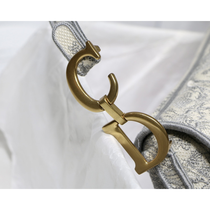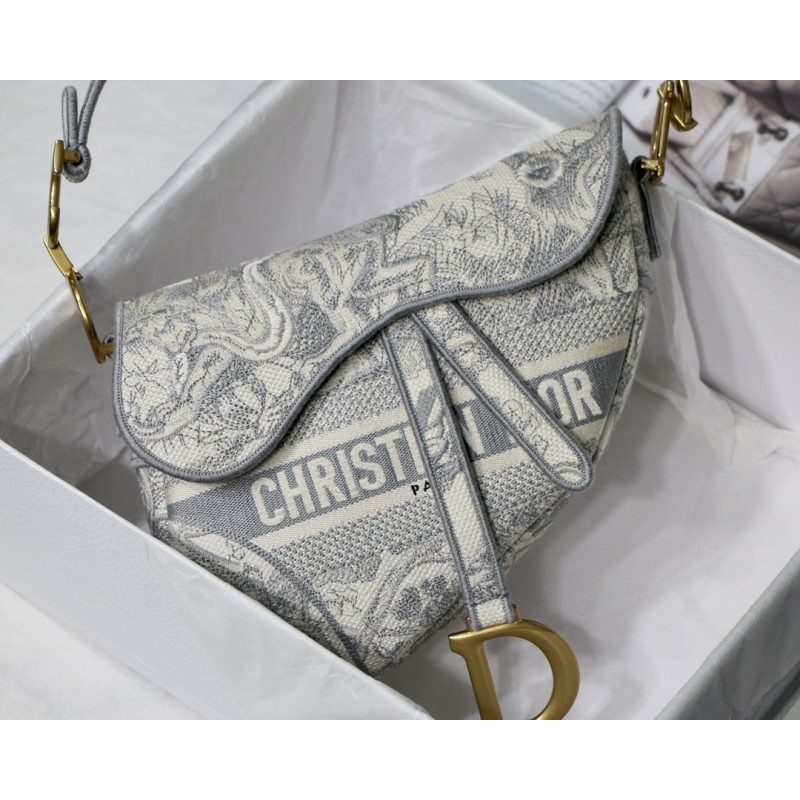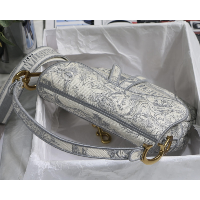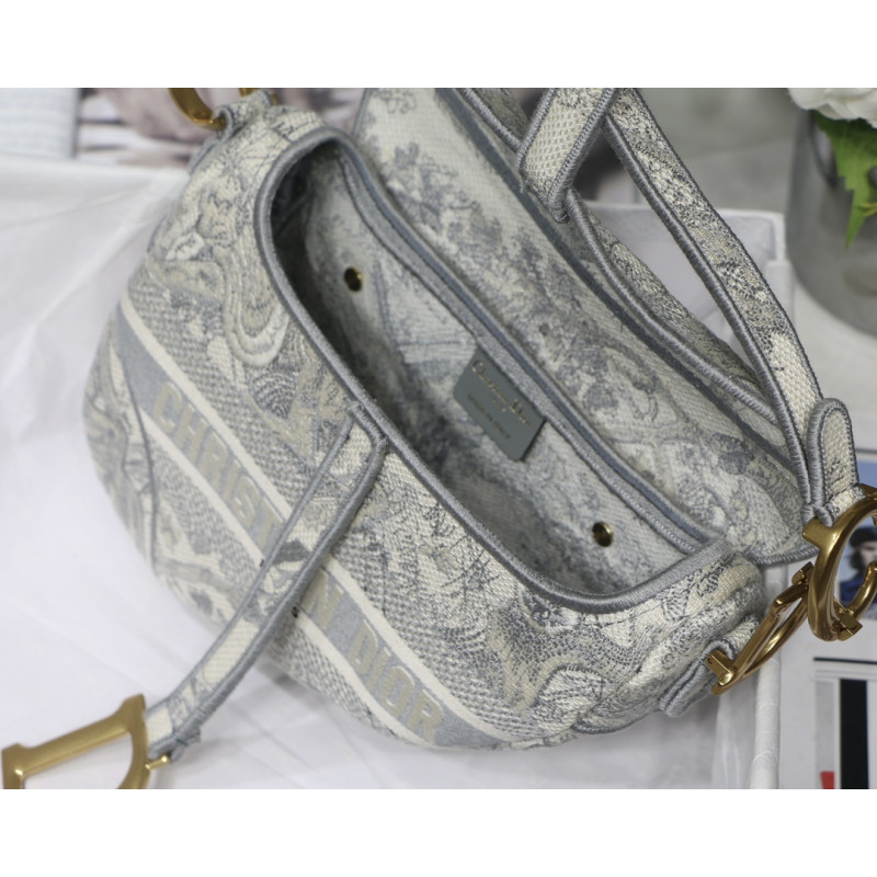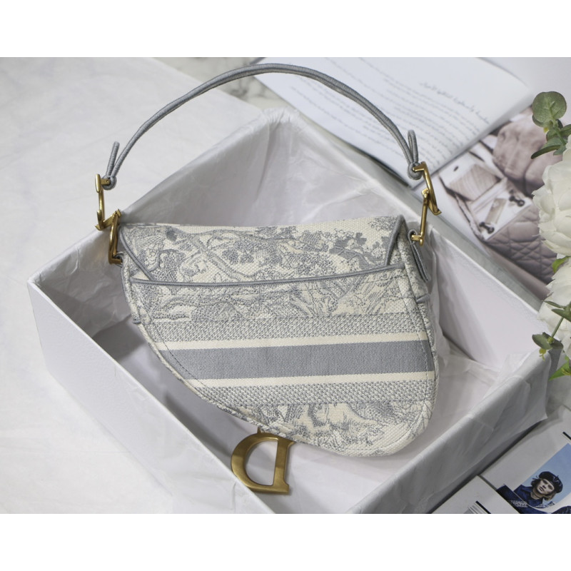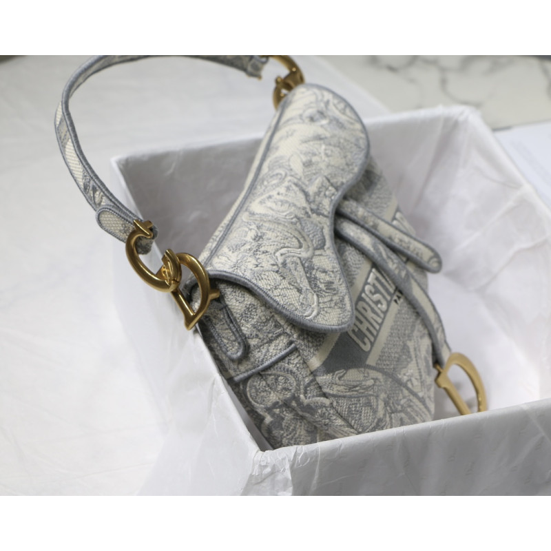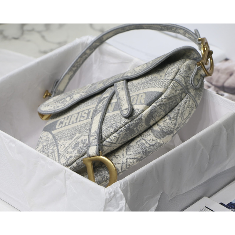 Embroidered with the Toile de Jouy motif, it reveals a saddle flap with a magnetic D-shaped stirrup clasp, as well as a CD signature in antique gold-finish metal on either side of the shoulder strap. This saddle bag has an adjustable and detachable spaghetti strap and can be carried by hand, over the shoulder or across the body.